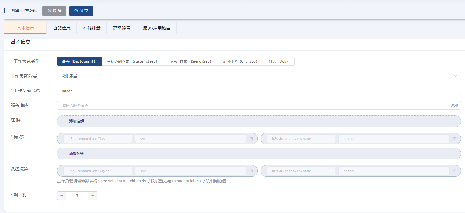 一、创建一个nacos工作负载,授予他的label是:k8s.kuboard.cn/name=nacos