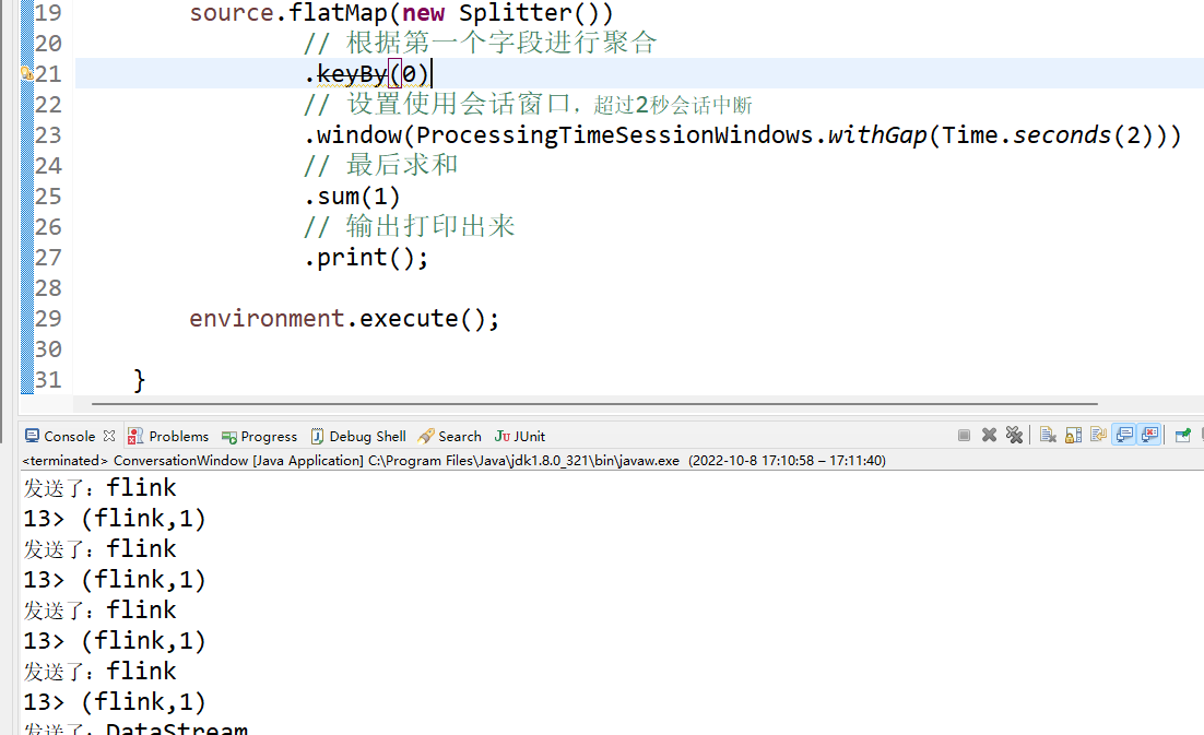 在flink中,我们主要使用的会话窗口函数是:ProcessingTimeSessionWindows.withGap。下面,我们演示下如何使用会话窗口