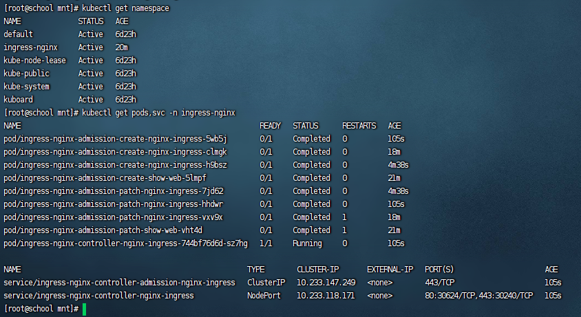 此时在服务器上会自动创建一个名称为:ingress-nginx的名称空间,对应相关的pod都启动在这个名称空间里面: