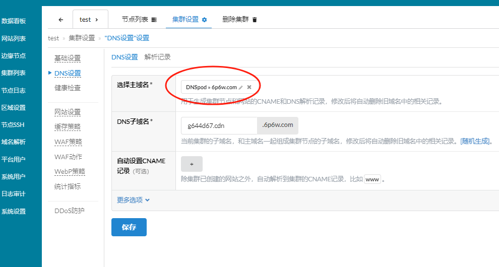 接下来比较重要的是我们需要为当前的cdn分配一个域名,这样子在创建网站的时候,会自动分配一个二级域名作为我们想要配置cdn服务的cname标识。并且他也会自动把我们的集群边缘节点ip解析到DNS上。下面我们演示下。