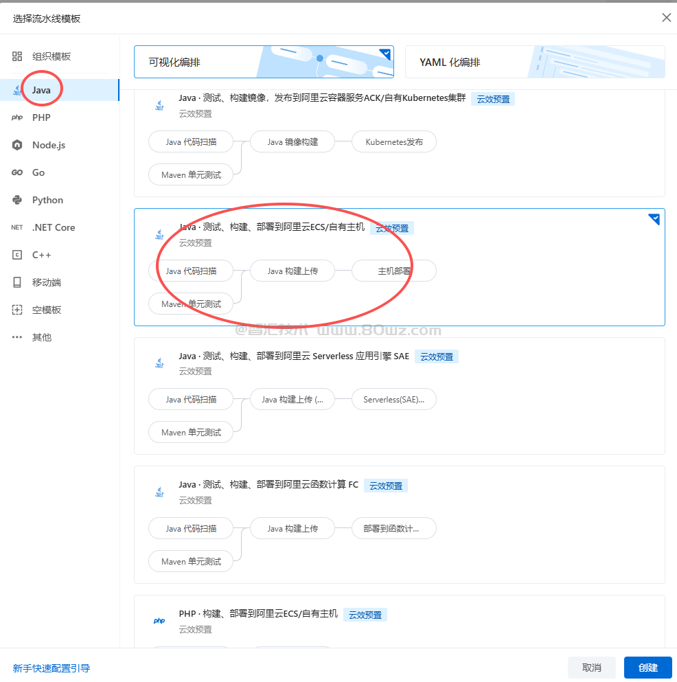 首先我们创建一个流水线,选择java版本的模板就可以,在流水线模板里面,其实已经自带了这里的对应流程模板,如下图: