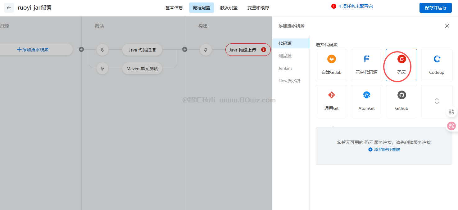 这里我们以ruo-yi项目为例,我们把若依的项目给下载下来,根据自己的改动之后,上传到自己的仓库里面去就可以了,所以这里我们添加自己的流水线源,点击添加流水线源,选择码云即可
