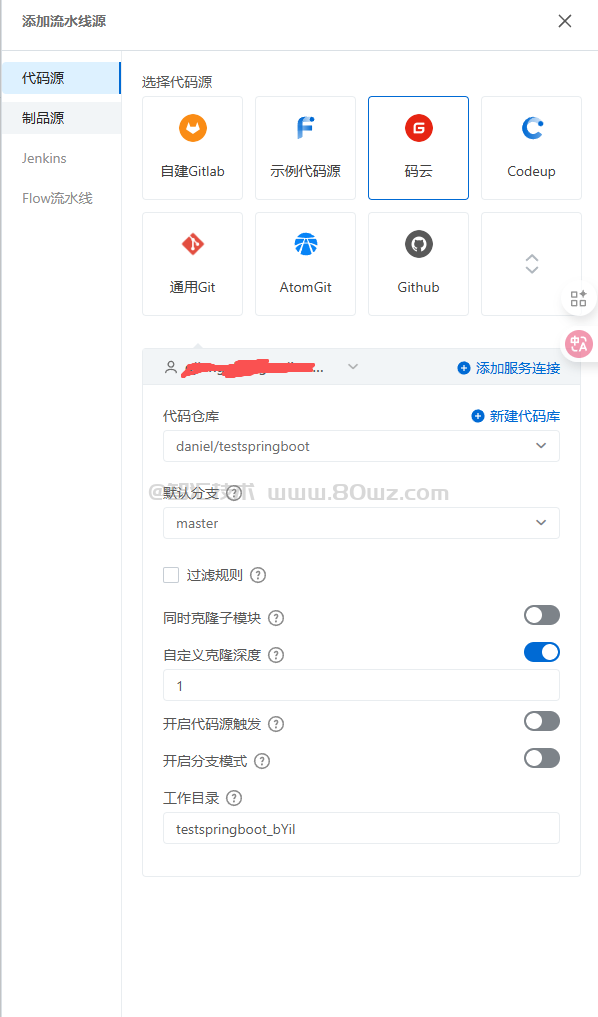 接下来添加一个服务链接,把自己的码云账号同步上去,选择对应的项目即可。