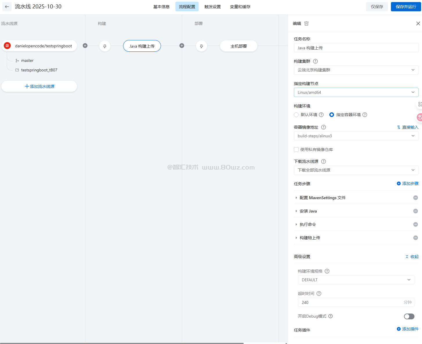接下来配置java构建上传,这里构建上传主要是使用maven打包而已,所以涉及到的主要是任务步骤环节,主要的步骤有:
