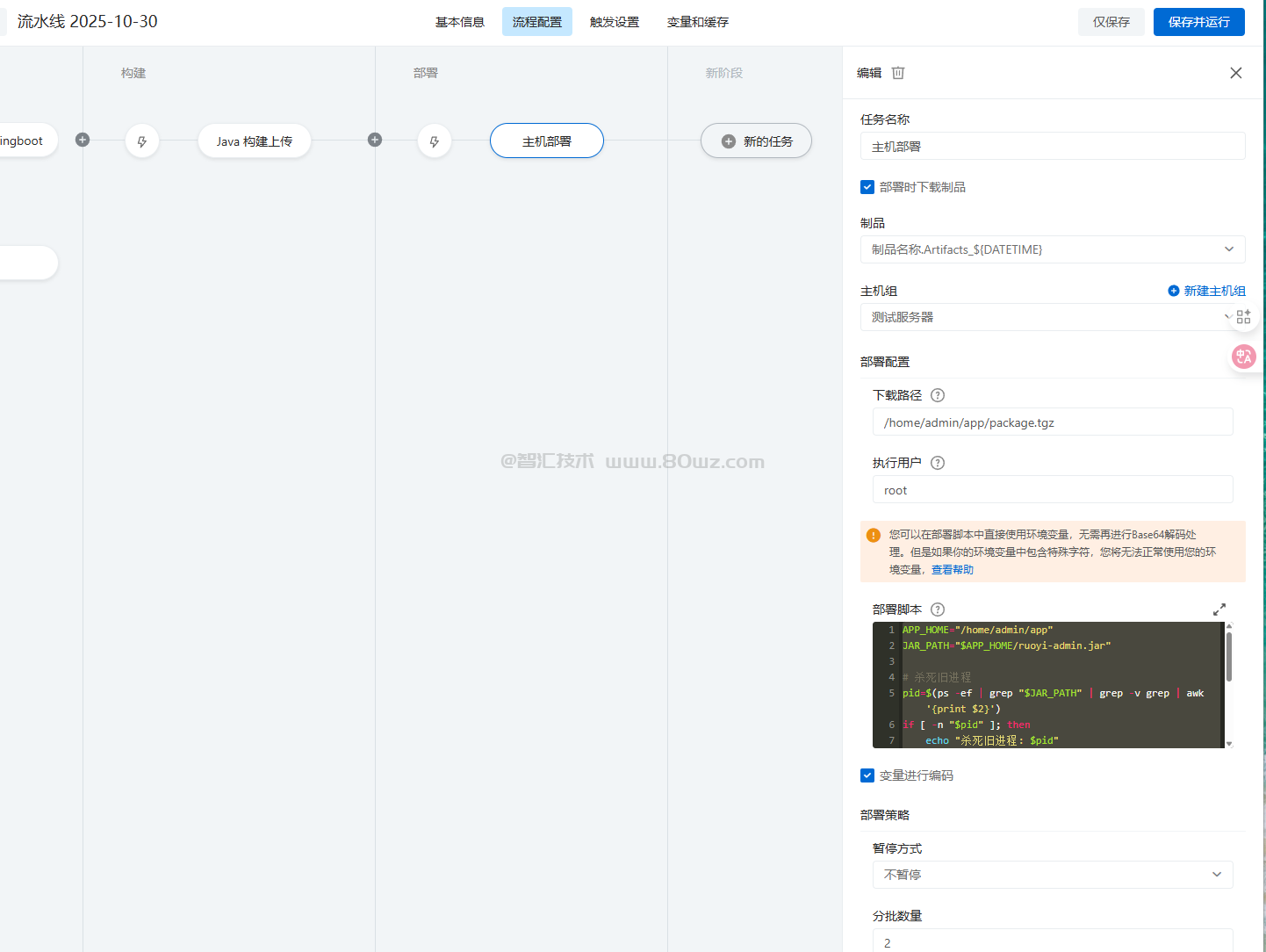 1、主机组:这是部署jar的服务器 2、部署脚本:这里需要编写对应的jar启动脚本 3、部署策略:这里主要把暂停方式修改为不暂停