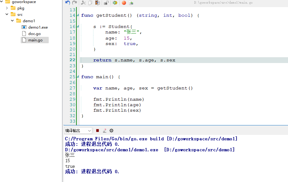 这里就相对于其他语言来说就有点不一样了,例如在java语言中,每个方法的返回值只有1个对象,如果涉及到很多值的话,我们会创建一个对象,然后把这些值放到这个对象里面去,然后再返回这个对象,但是在go语言中,这里就直接支持返回多个值,示例如下: