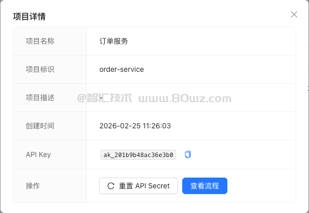 项目创建时自动生成: ├── API Key: ak_xxxxxxxxxxxxxxxx (明文存储,用于标识) └── API Secret: sk_xxxxxxxxxxxxxxxx (哈希存储,用于验证)