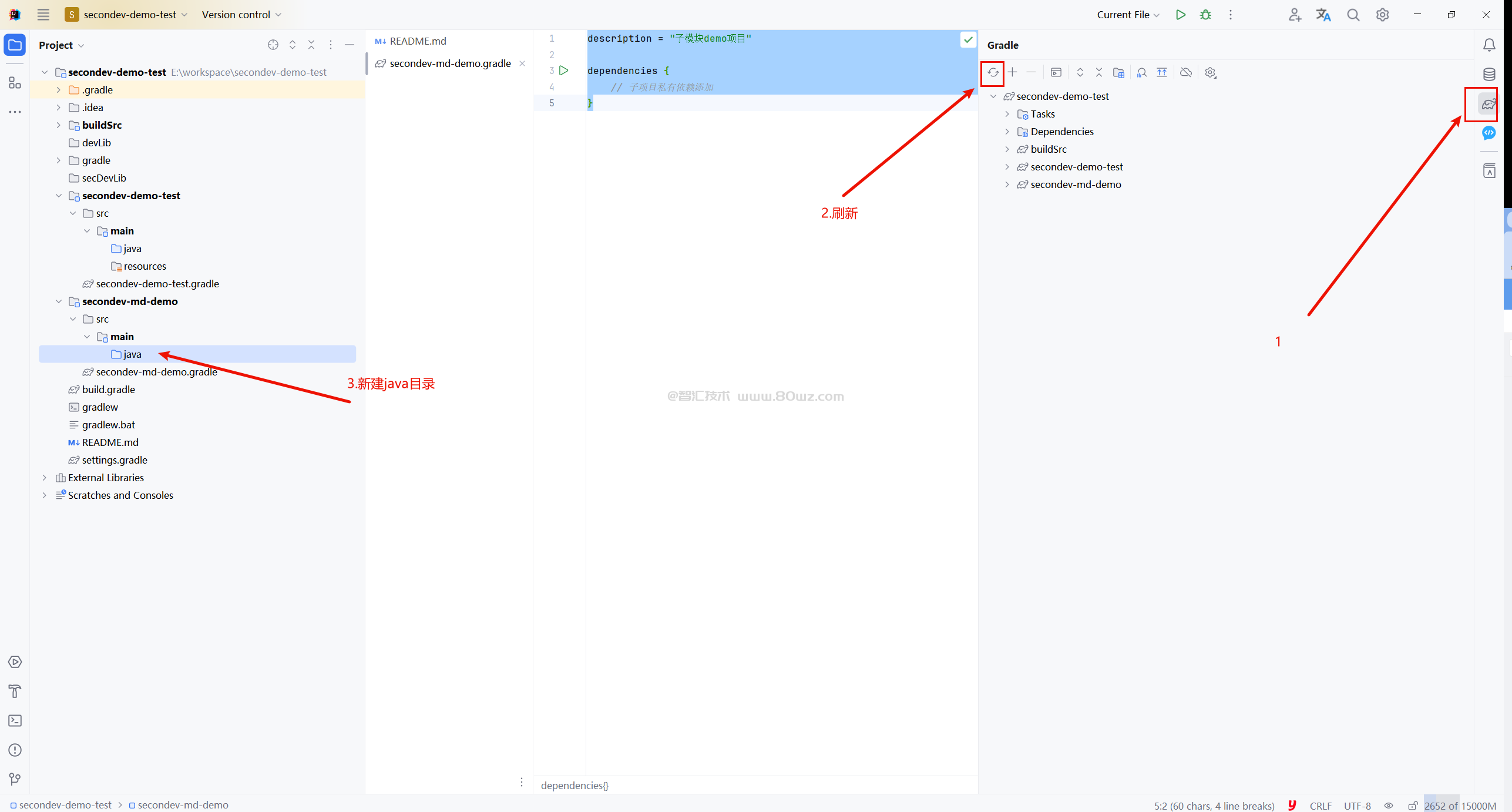 然后需要在idea中刷新gradle的配置,他会将新建的目录加载成子项目,然后我们再在项目下创建src/main/java目录,操作步骤如下图:
