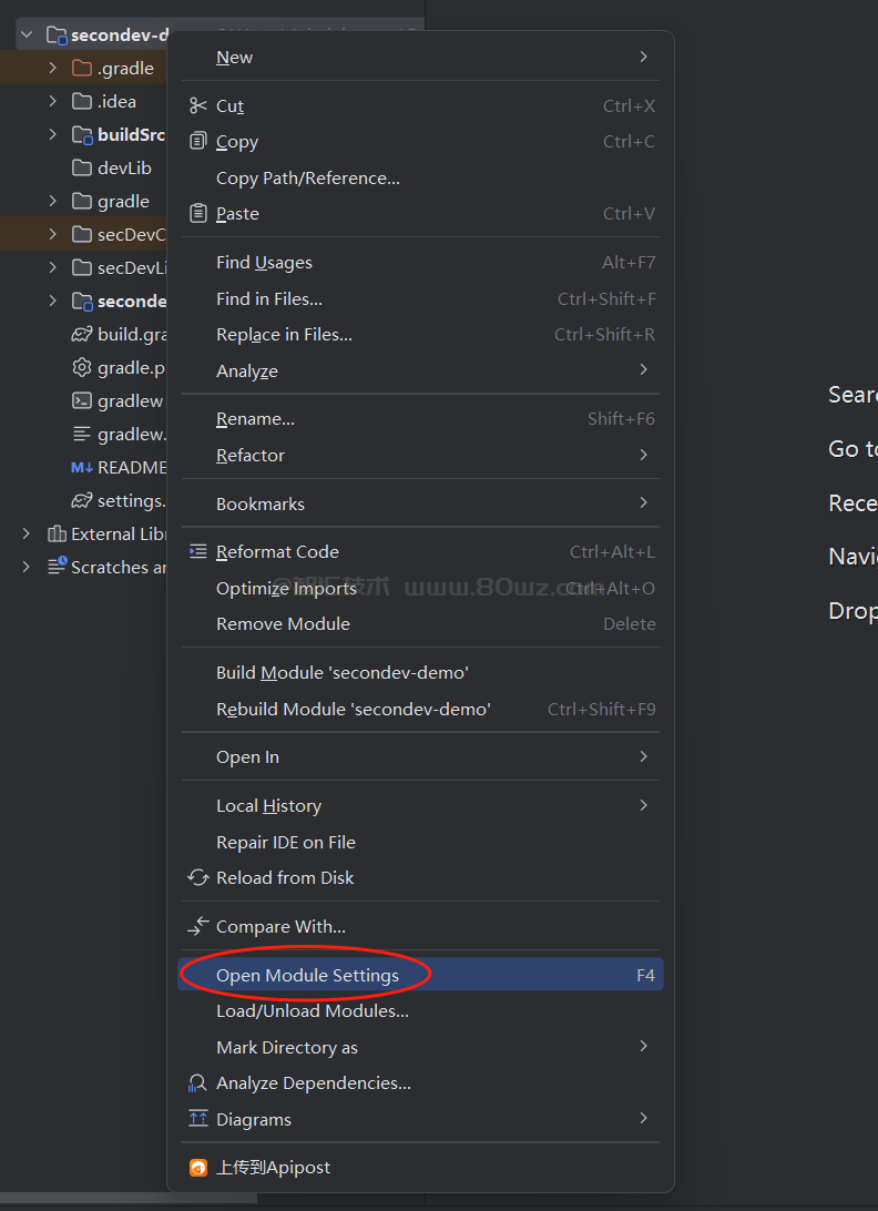拷贝进来之后,我们需要把这个依赖包放进idea这个项目的环境中去,右键项目,选择open module settings