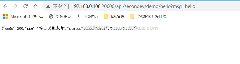 接下来我们就可以访问刚才的接口了,使用的信息就是http://192.168.1.1:1100/api/secondev/demo/hello。可以看到这里前面是泛微E10平台的地址,后面的路径是我们二开编写的代码接口。