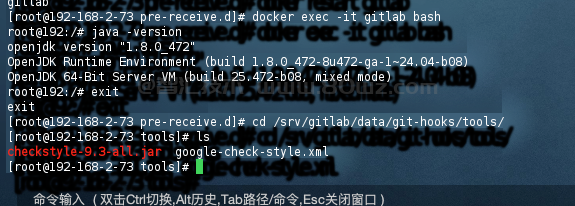 #在宿主机上执行 mkdir -p /srv/gitlab/data/git-hooks/tools #将 checkstyle-9.3-all.jar 和 google-check-style.xml 从本地拷贝到 /srv/gitlab/data/git-hooks/tools/ 下