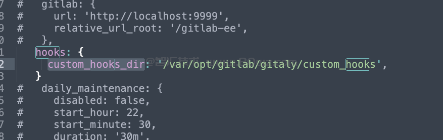 搜索custom_hooks_dir,可以看到最新版本的 git 配置文件这里是一个 json,所以需要把这里打开