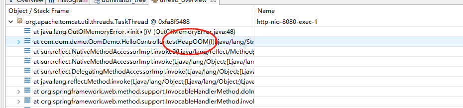 很直观的进行了一个排序,说明在这里占用内存最多的是这个HeapOOM对象,排在第二位的是一个数组object。凭经验我们能知道这个是数组里面存储了过多的HeapOOM对象导致的内存溢出。
