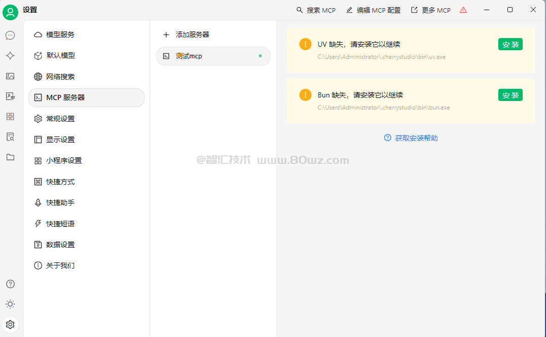 应该是没有安装UV和BUN,进入到cherry studio,点击设置->MCP服务器,可以看到右上角有个感叹号