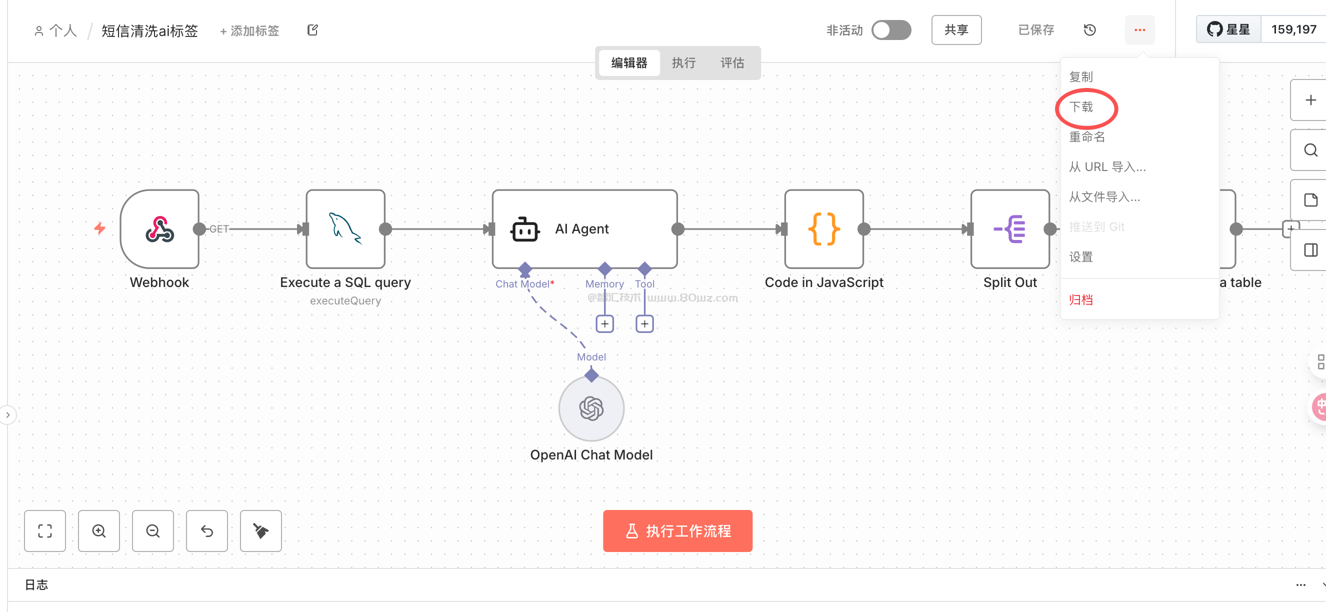 n8n工作流不能直接在工作流列表中直接导出,需要进入到n8n的对应工作流,右上方的三个点下面有一个下载按钮,点击下载就会导出json了。