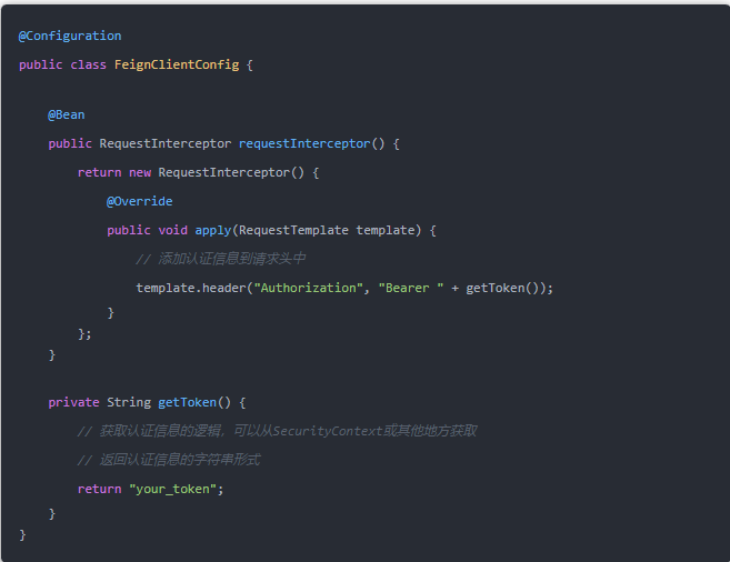 比较常见的一个做法是,使用**传递认证信息。可以通过实现RequestInterceptor接口来定义**,在**里,把认证信息添加到请求头中,然后将其注册到Feign的配置中。如下图: