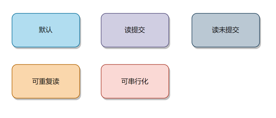 1、DEFAULT:采用 DB 默认的事务隔离级别 2、READ_UNCOMMITTED:读未提交 3、READ_COMMITTED:读已提交 4、REPEATABLE_READ:可重复读 5、SERIALIZABLE:串行化