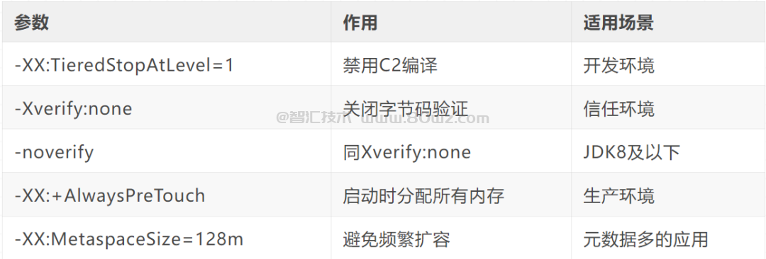 对于jvm来说,使用-XX:TieredStopAtLevel=1(快速编译)、-Xverify:none(关闭字节码验证)等组合。可降低启动时间约40%。具体的参数如下图: