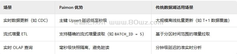 Paimon与传统数据湖(如 Apache Iceberg、Hudi)的差异如下图: