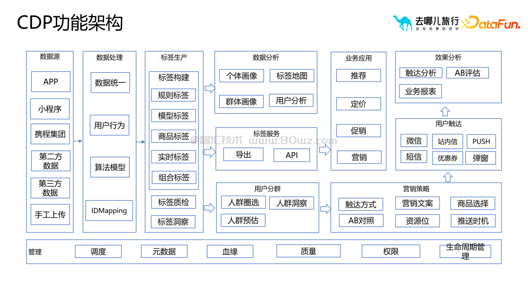 CDP平台(画像标签平台)涵盖画像标签的生产、数据分析、业务应用和效果分析。去哪儿网将其与策略平台整合,实现画像构建、人群圈选和营销动作的全生命周期管理。