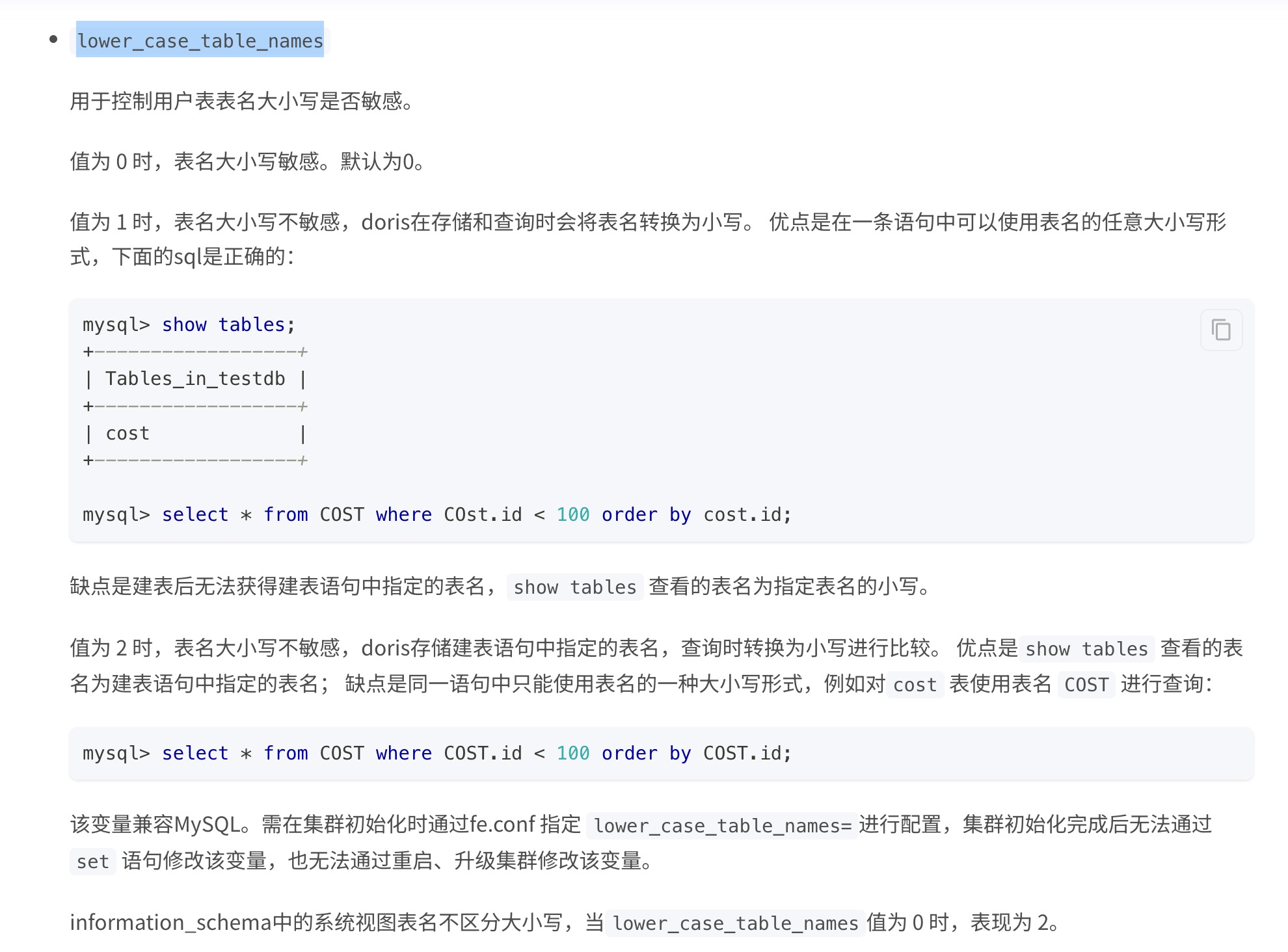 请问,doris的数据库名和表名是否支持大小写不敏感?版本1.2.2