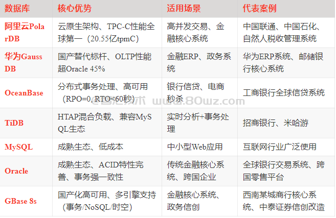 1、阿里云PolarDB 2、华为GaussDB 3、OcenBase 4、TiDB 5、Mysql 6、Oracle 7、GBase 8s