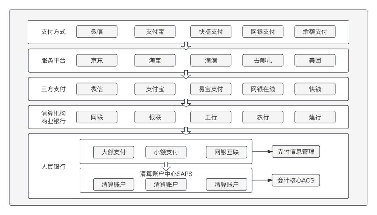 主要从以下方面考虑:支付方式,服务平台,三方支付,清算机构,人民银行,具体示例如下图: