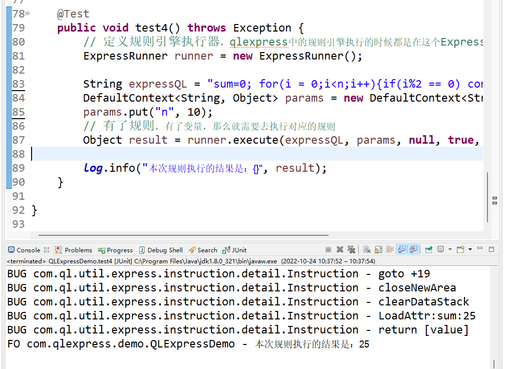 @Test public void test2() throws Exception { // 定义规则引擎执行器,qlexpress中的规则引擎执行的时候都是在这个ExpressRunner里面执行的 ExpressRunner runner = new ExpressRunner(); String expressQL = "a > b "; DefaultContext<String, Object> params = new DefaultContext<String, Object>(); params.put("a", 1); params.put("b", 2); // 有了规则,有了变量,那么就需要去执行对应的规则 Object result = runner.execute(expressQL, params, null, true, true); log.info("本次规则执行的结果是:{}", result); }