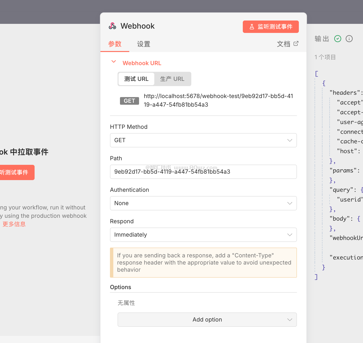 这就代表这里的webhook是可以接收任何参数的,同时还会把接受到的所有参数都向后面的节点进行传递。