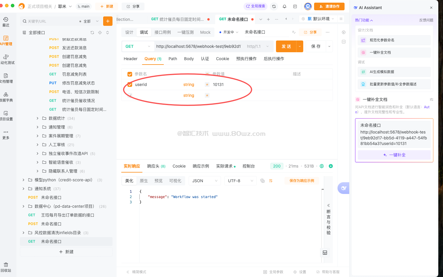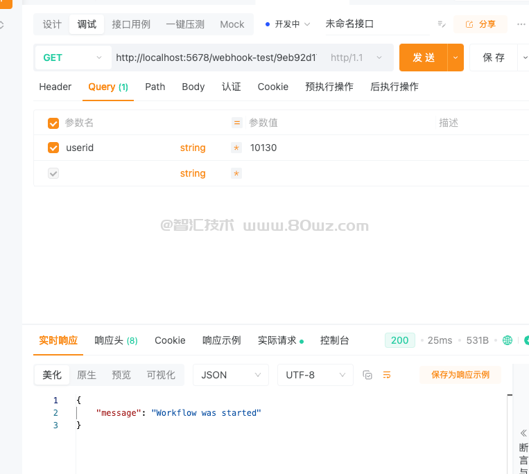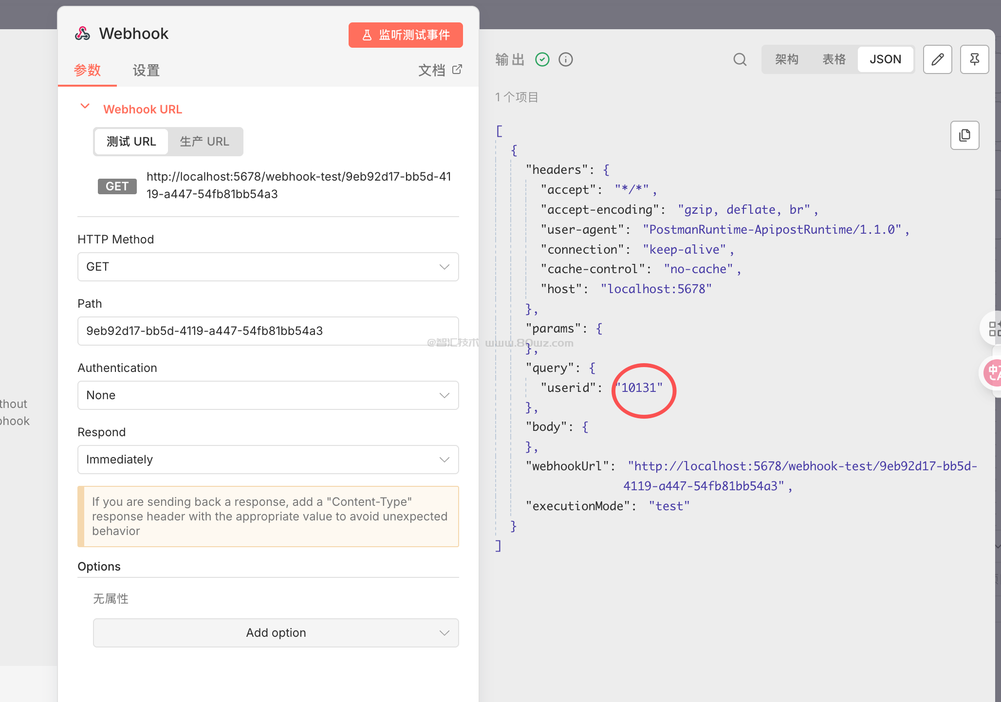 这个webhook节点会自动提供一个http的接口,但是他不能指定接收的参数,这些参数都是可以自己自定义的,比如我们请求这个http接口,然后传递一个userid的参数