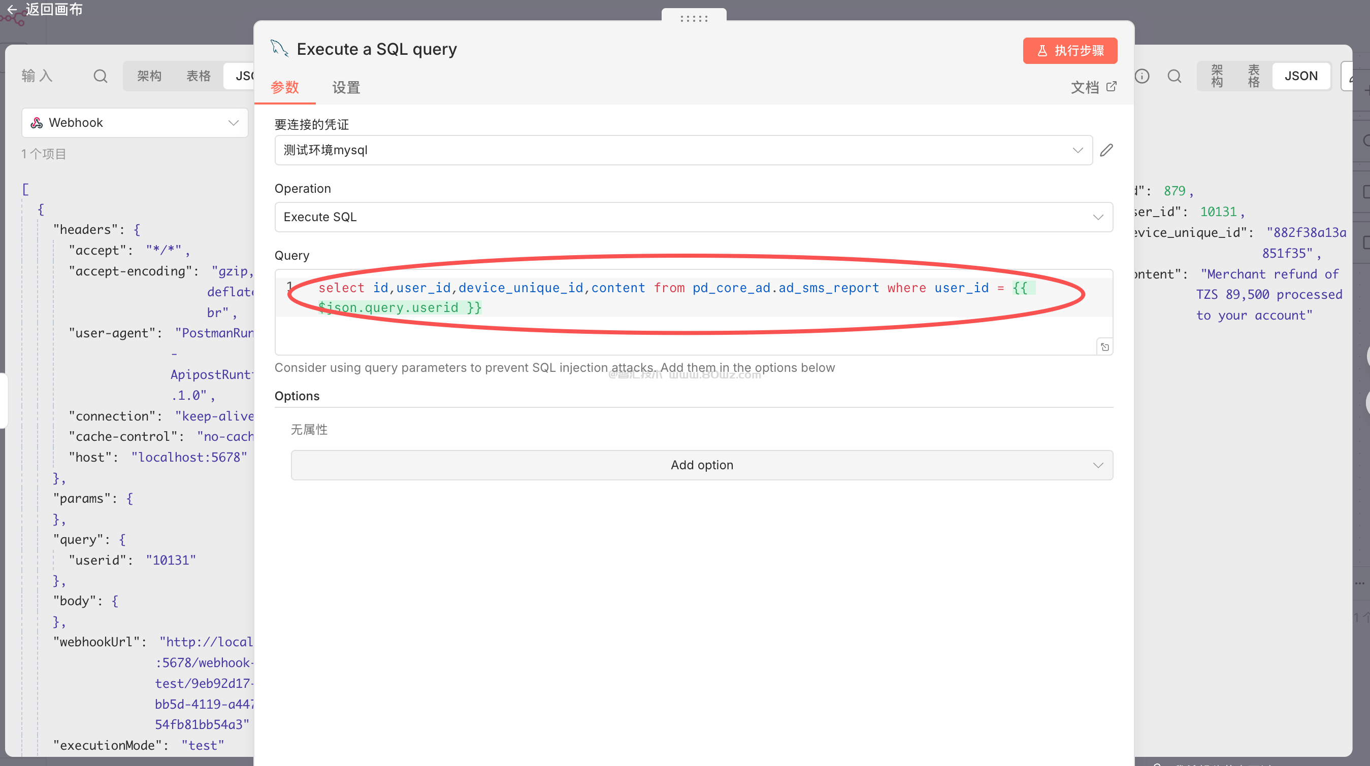 接下来我们需要添加一个mysql节点,他的逻辑是:根据前一个节点传递进来的userid,在数据库中查询这个人的所有短信,所以添加一个mysql查询节点即可,示例如下: