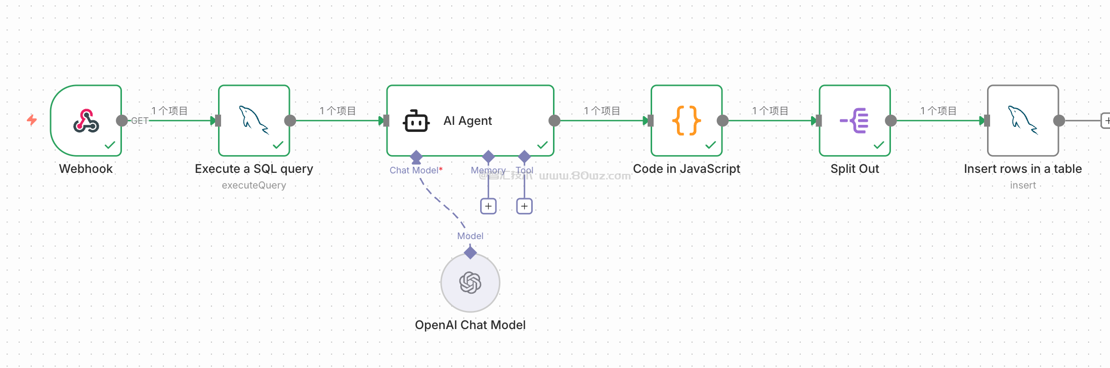 以上的流程就是这样子。那么我们使用n8n工作流怎么实现这个业务场景的自动化呢?下面看看我这里组织的n8n的工作流,如下图: