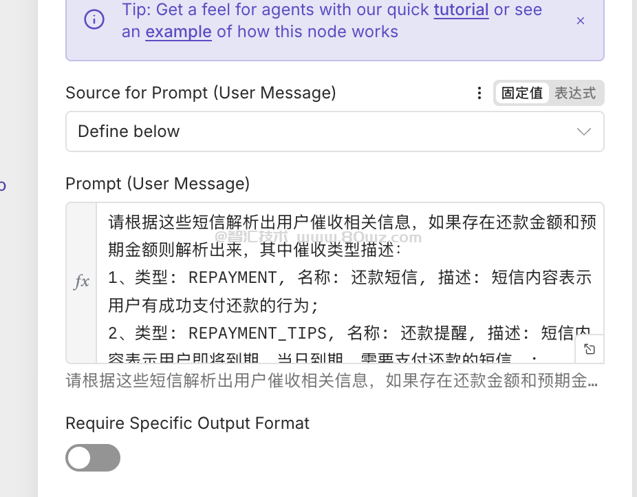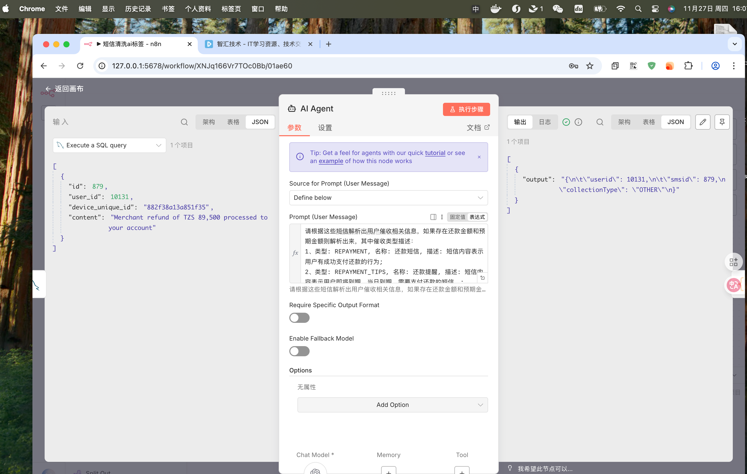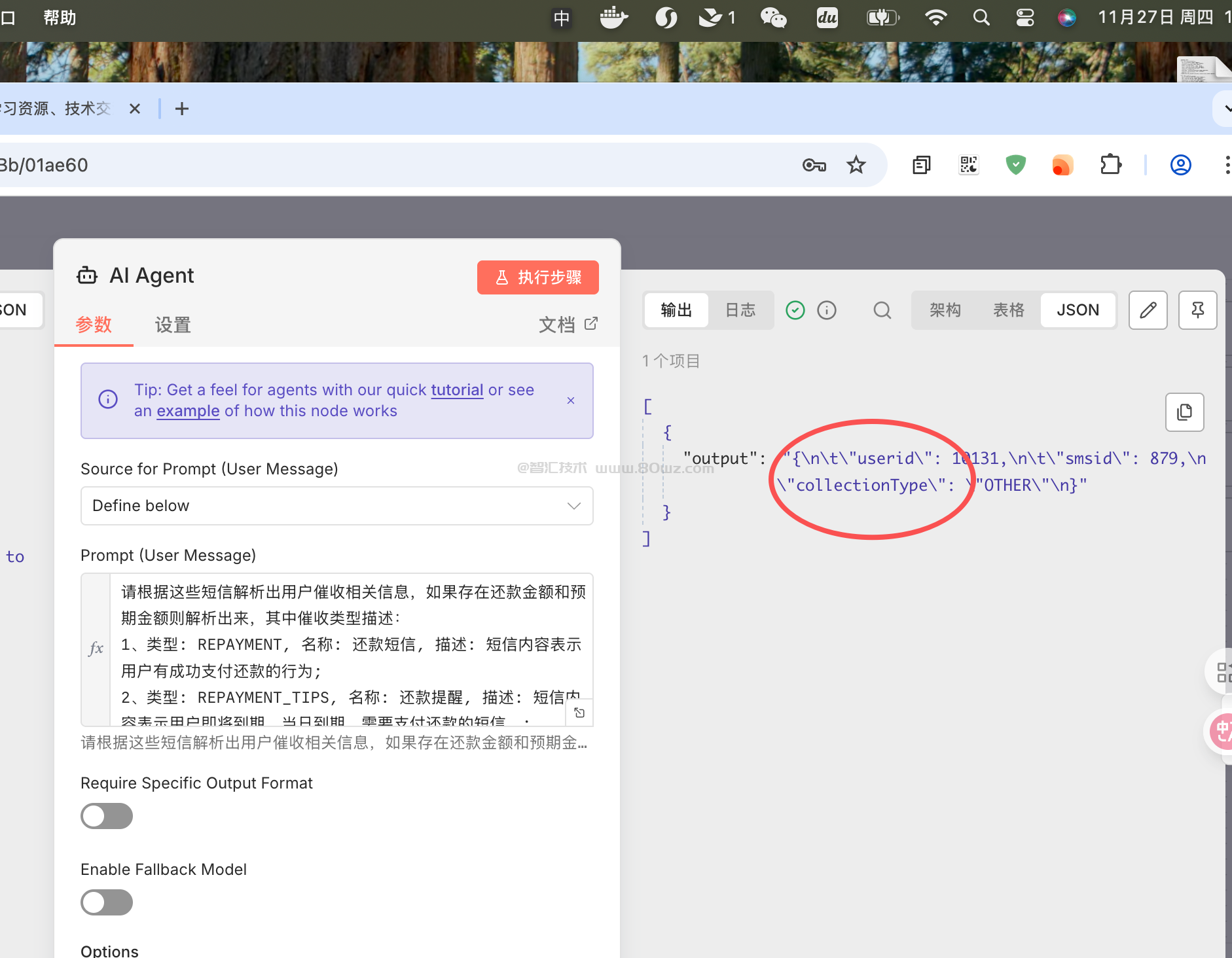 这一步就是我们的核心了,即上一步我们拿到了所有的短信记录,这里我们需要把这些短信记录传递给ai,然后让ai帮我们打标签,所以这里我们添加一个ai agent节点,然后添加一个模型,这里我们模型还是使用qwen3-8b(因为免费,哈哈)。