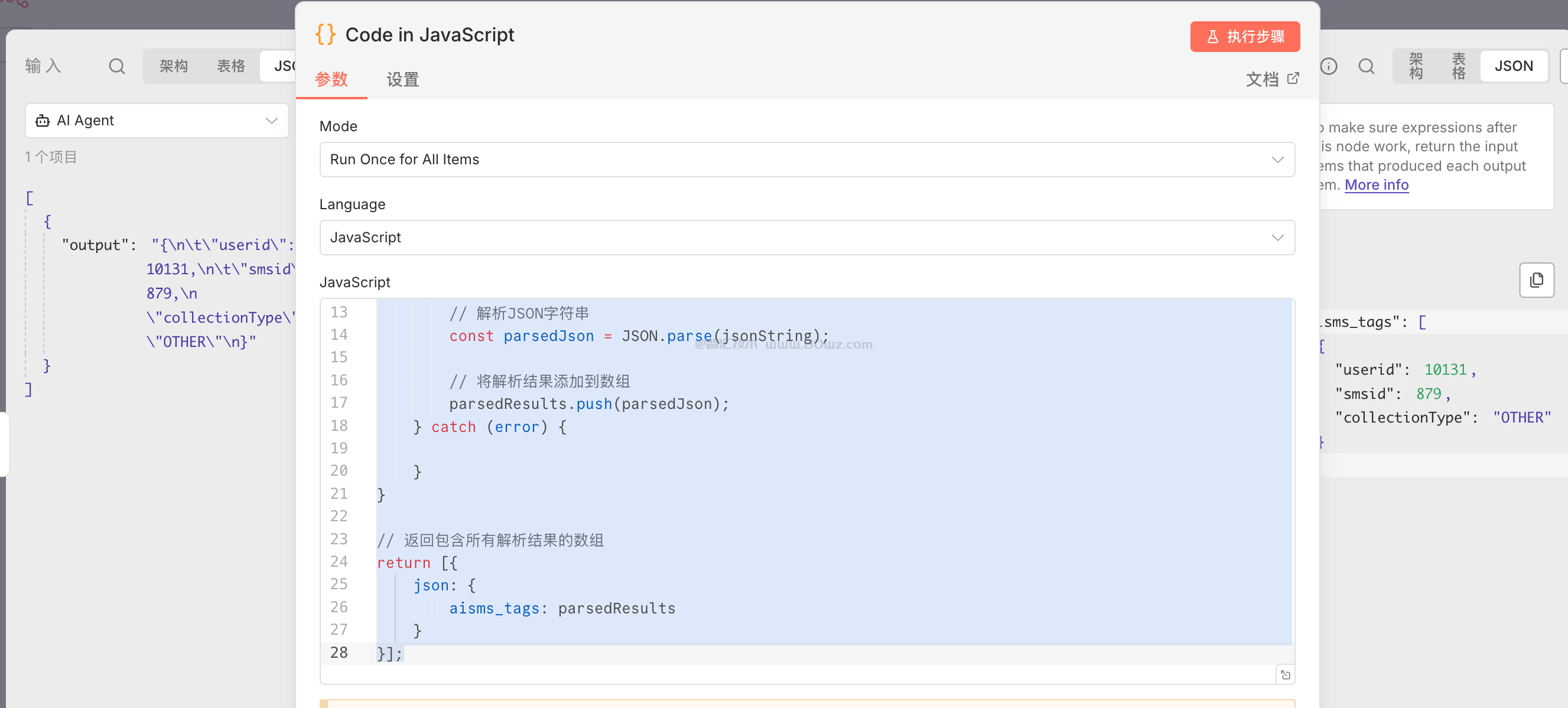 上一步的输出我们可以看到,ai agent返回数据的时候是返回的字符串,并且把这个字符串塞到了output下面,这里json字符串是没法直接使用的,需要给他转换成纯json,所以这里需要一个code节点,我们用javascript进行编写即可,这里的代码我也不会写,都是扔给ai来写的,我这里用的腾讯元宝,最后ai写出来的代码是: