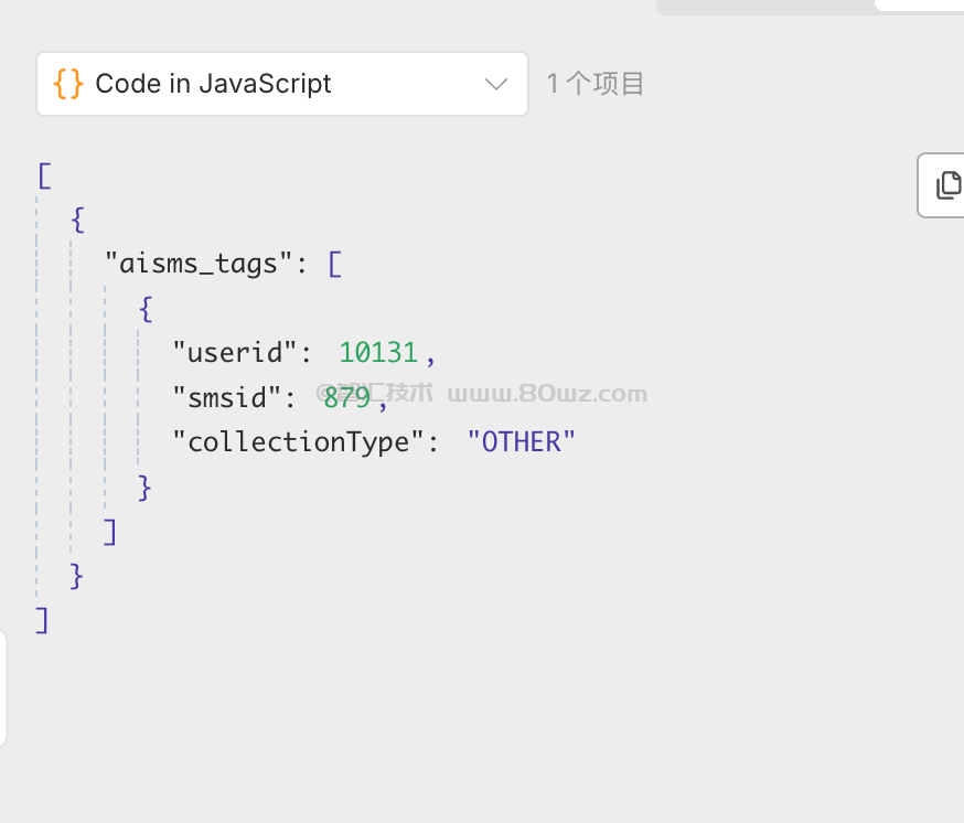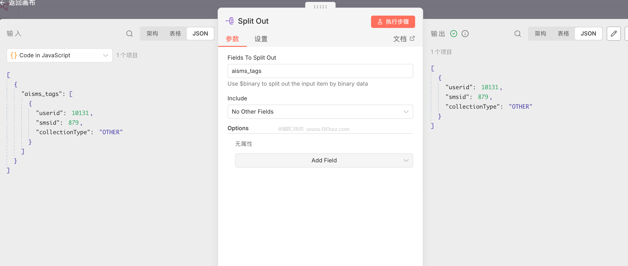 所以无法实现后续的数据库插入操作(因为解析的话,选择变量,他会标注插入具体位置的值,比如第3个object的值,不是每一个object的值,最后无法实现插入所有的数据),所以这里我们需要split out 节点把这里的aisms_tags给他拆出来,把所有的object都放到一级数组节点下,如下图: