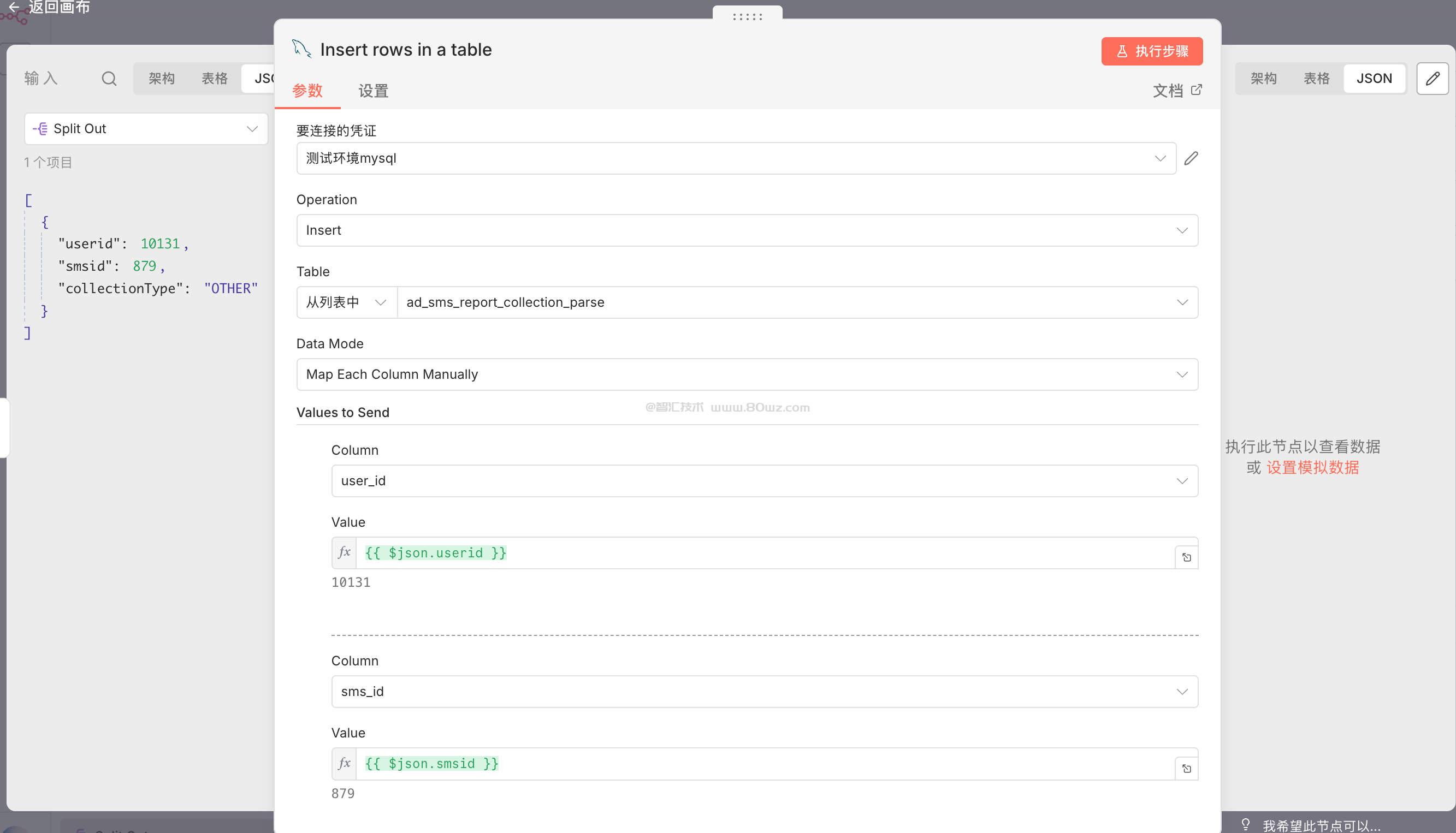 到这里我们前置操作就全部完成了,直接添加一个mysql的节点,然后选择insert rows in a table节点即可,然后进行字段的配置: