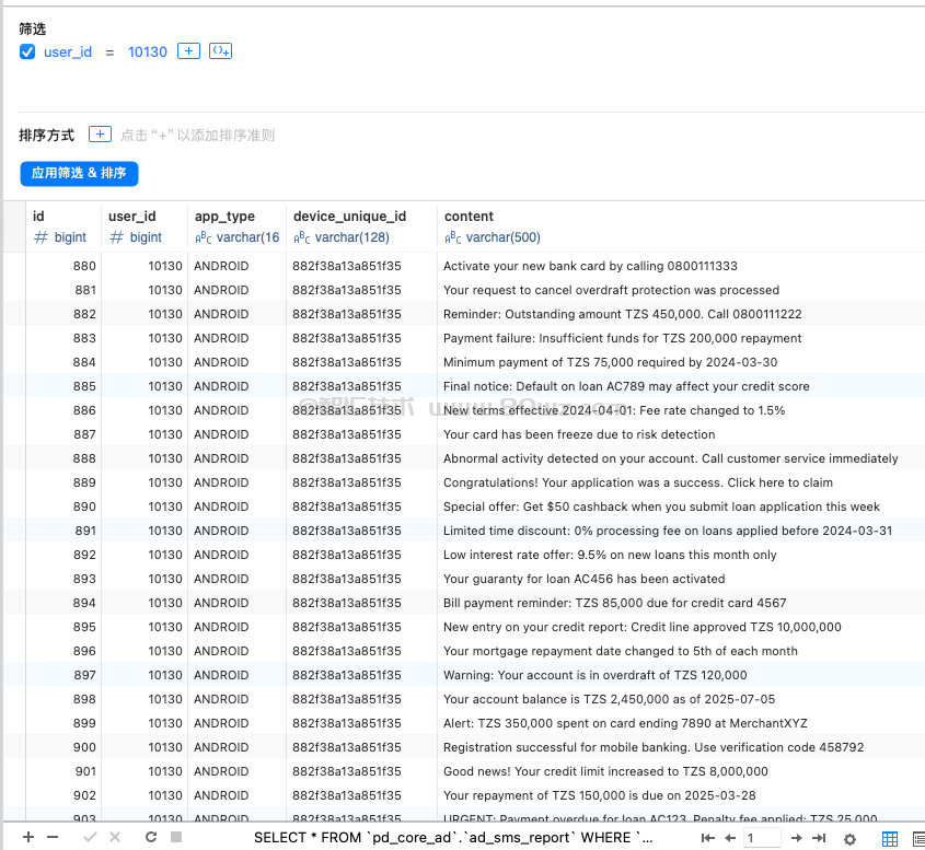 以上说明我们现在已经利用ai,把标签给打上去了,同时还添加了对应的其他字段,比如userid,sms_id等。以上我们就完成了使用ai帮我们打标签的目的。