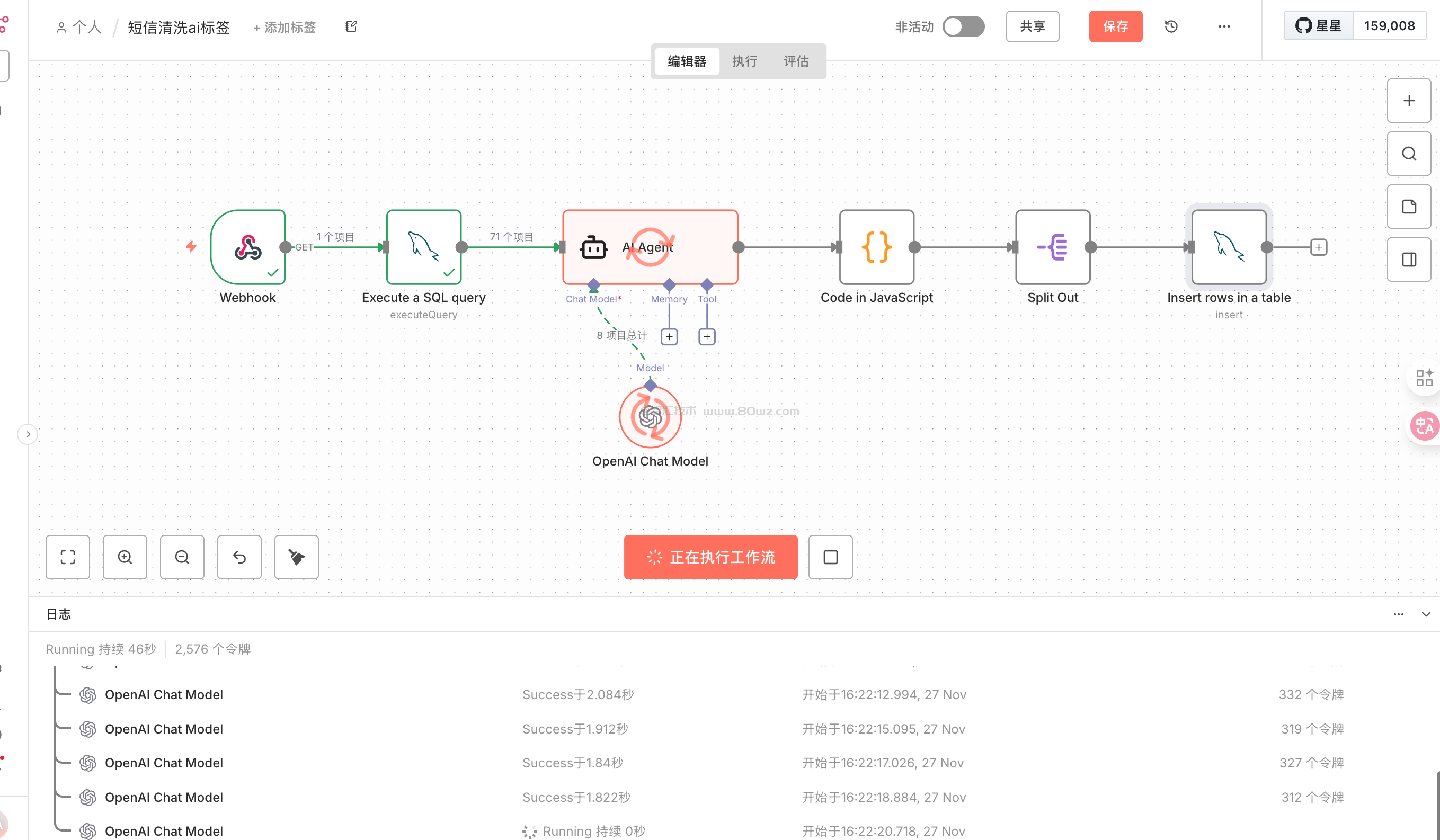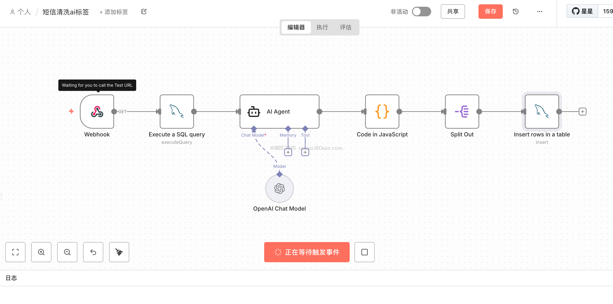 1、上传短信 2、触发webhook 3、查询所有短信内容 4、逐条给ai,让ai打标签 5、把打的标签插入到数据库