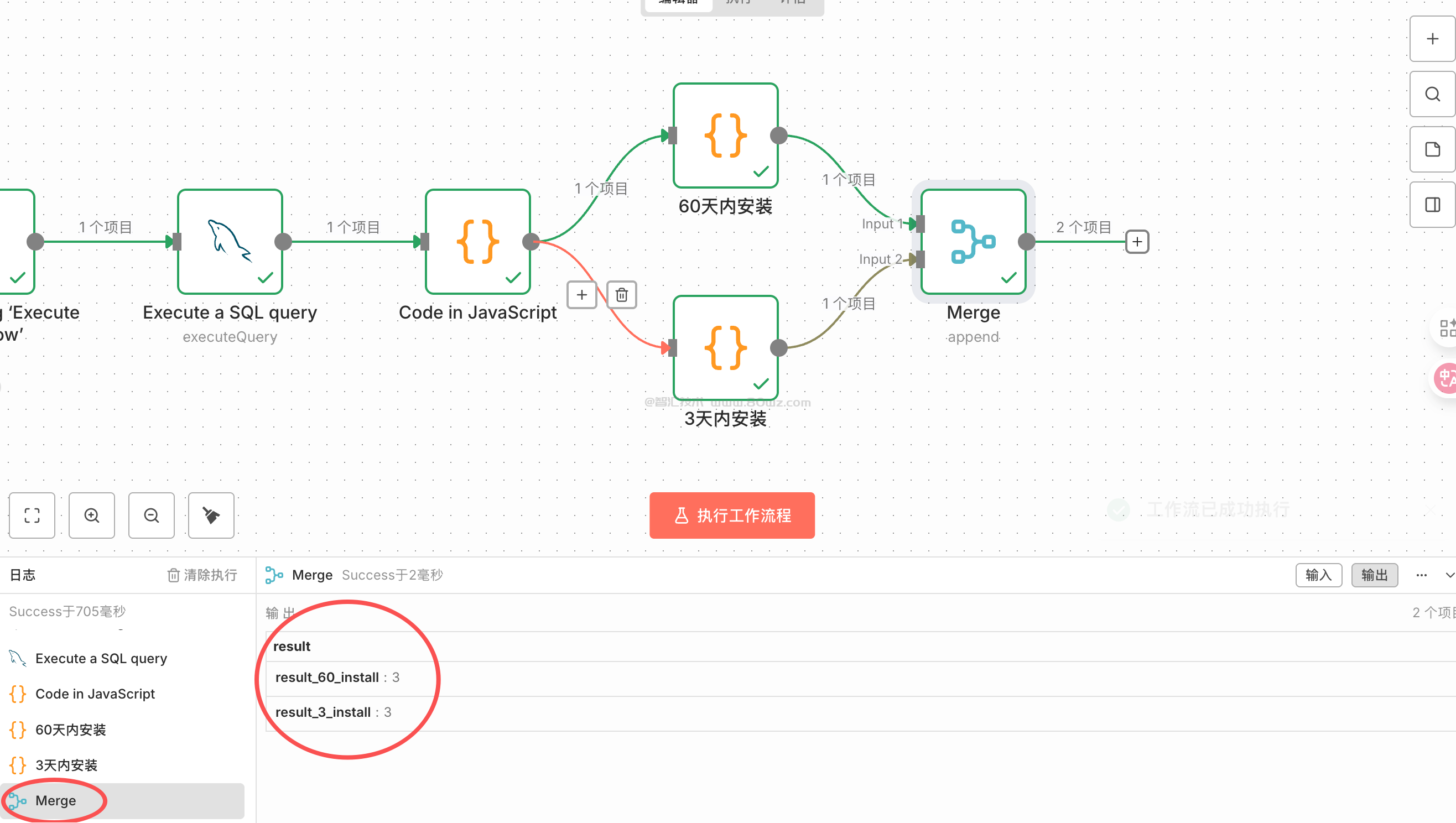 像上图这样的场景,第一个分支处理数据,获取了一部分,第二个分支处理数据获取了一部分,需要一个merge节点吧这些结果给聚合成一条结果即可,比如我们这里的场景是上游第一个节点,我们解析处理60天的数据,上游第二个节点,我们解析处理3天的数据,最后需要把这两部分节点输出的数据整理成一条数据,这里就可以merge节点,首先看下效果: