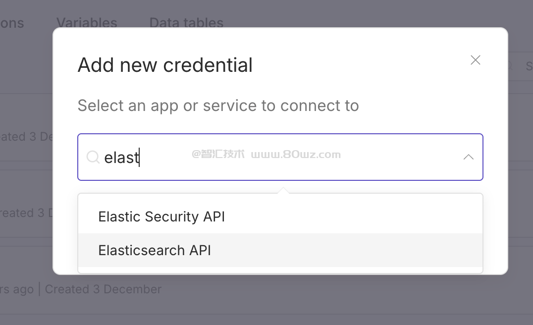 这里使用上还是前面的步骤,先要添加凭证,一般来说elasticsearch的部署,大家有时候会设置密码,有时候不会设置密码,但是都不影响在 n8n上配置elasticsearch的凭证,只是如果elasticsearch服务器不需要认证的话,则不需要填写账号密码,如果elasticsearch服务器需要认证的话,则需要填写账号密码。所以这里点击添加凭证,搜索elasticsearch