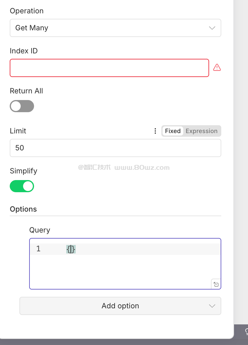 但是一般来说我们查询的时候不会直接查询整条数据或者整库的数据,都会带有一定的条件去查询数据,也就是编写elasticsearch的dsl,那这个dsl在哪写呢?其实就是在最下面的add option里面