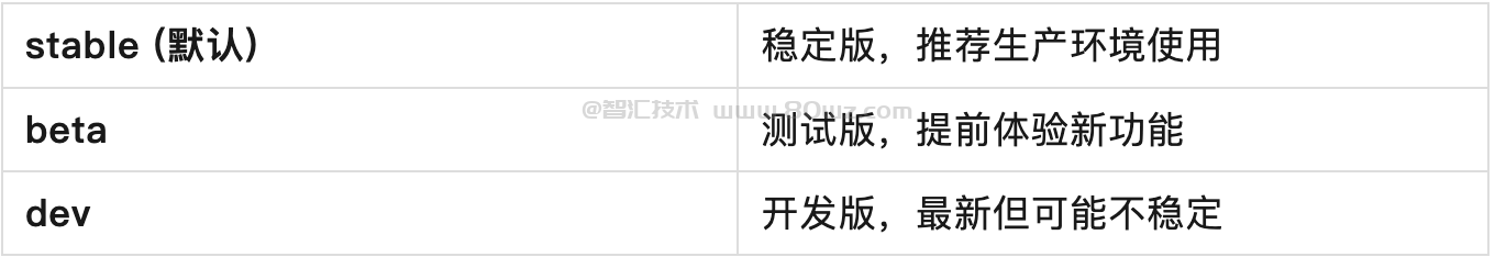 }channel可以设置stable/beta/dev,就是我们上面说的三个更新通道,设置后会根据设置的通道进行更新。