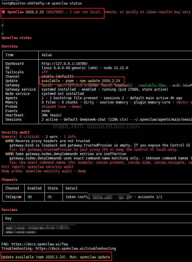 OpenClaw的版本更新很简单,首先我们用查看状态的命令: