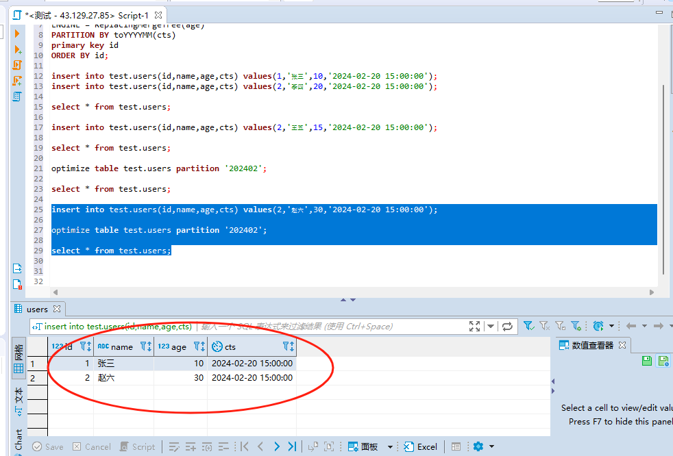#首先创建一张users表,模型为ReplacingMergeTree CREATE TABLE test.users( id Int32, name String, age Int32, cts DateTime ) ENGINE = ReplacingMergeTree PARTITION BY toYYYYMM(cts) primary key id ORDER BY id #插入两条用户数据 insert into test.users(id,name,age,cts) values(1,'张三',10,'2024-02-20 15:00:00'); insert into test.users(id,name,age,cts) values(2,'李四',20,'2024-02-20 15:00:00'); #接着查询下当前的数据 select * from test.users;