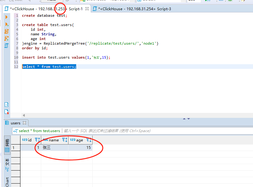 create database test; create table test.users( id int, name String, age int )engine = ReplicatedMergeTree('/replicate/test/users/','node1') order by id;