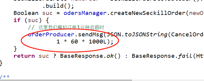 这里我们在秒杀接口里面添加代码,也就是创建订单完成之后,我们立马发送一条mq消息到死信队列,示例代码如下: