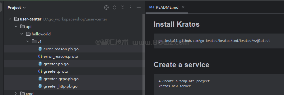 他里面包含一个greeter.proto和编译好的greeter相关的pb文件,前面我们介绍了,kratos定义接口的时候,实在proto里面定义的,所以这里我们打开greeter.proto文件