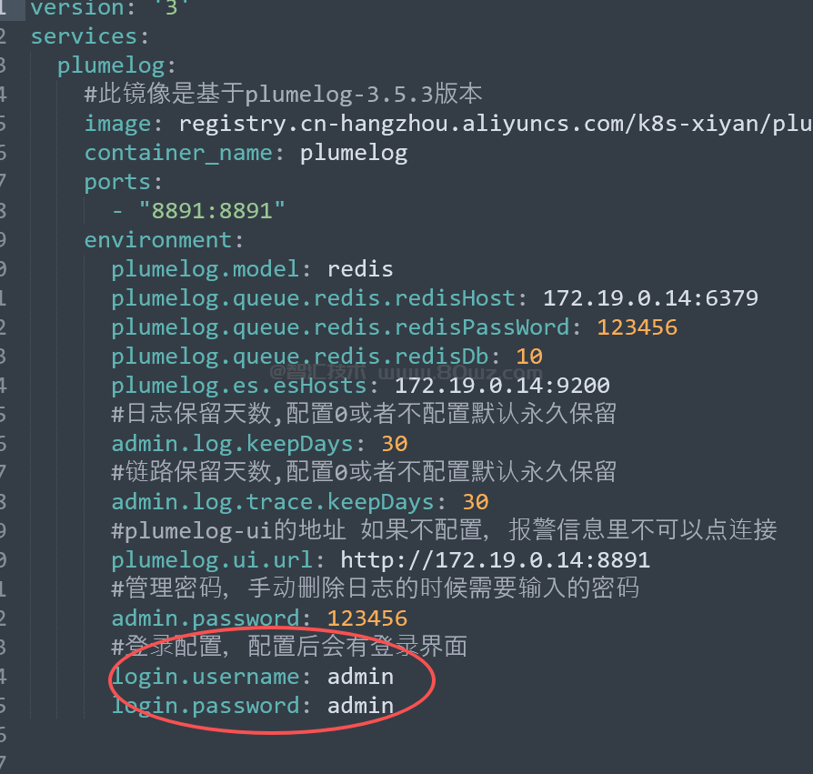 这里的账号密码这块我们是在plumelog的docker-compose.yml文件中的environment上配置的: