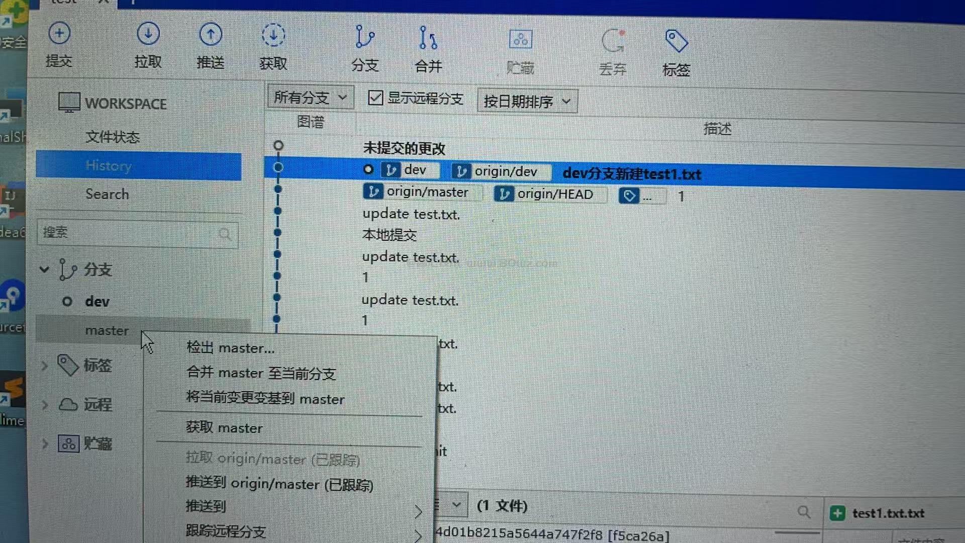 可以看到dev分支名称前面有一个圈,代表的就是当前使用的分支是dev分支。接下来我们把当前使用的分支切换成master分支,点击master分支,右键选择检出master.