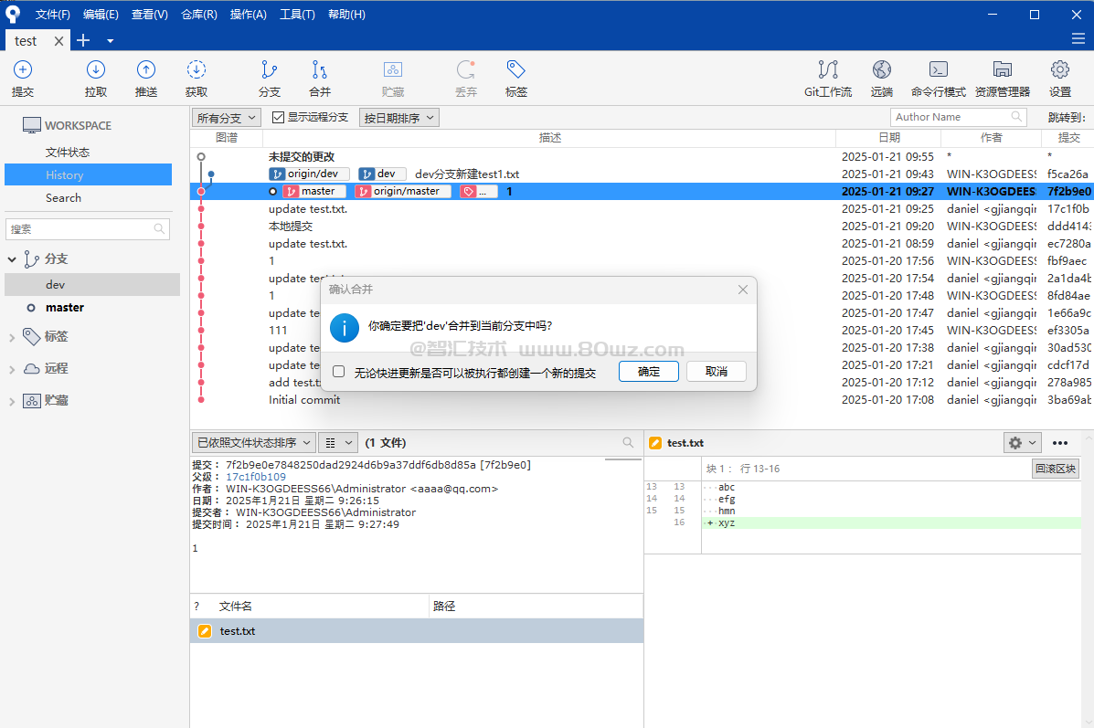 这时候我们鼠标指着dev,然后右键,选择合并dev至当前分支。